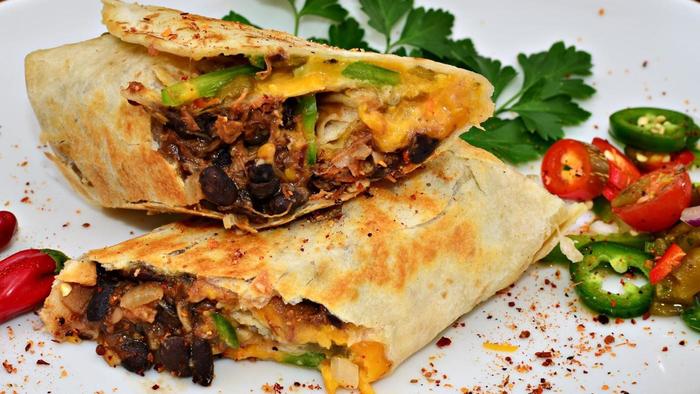 marha vagy csirkehús, chipotle paprika, fekete bab, sajt, babpüré, tortilla